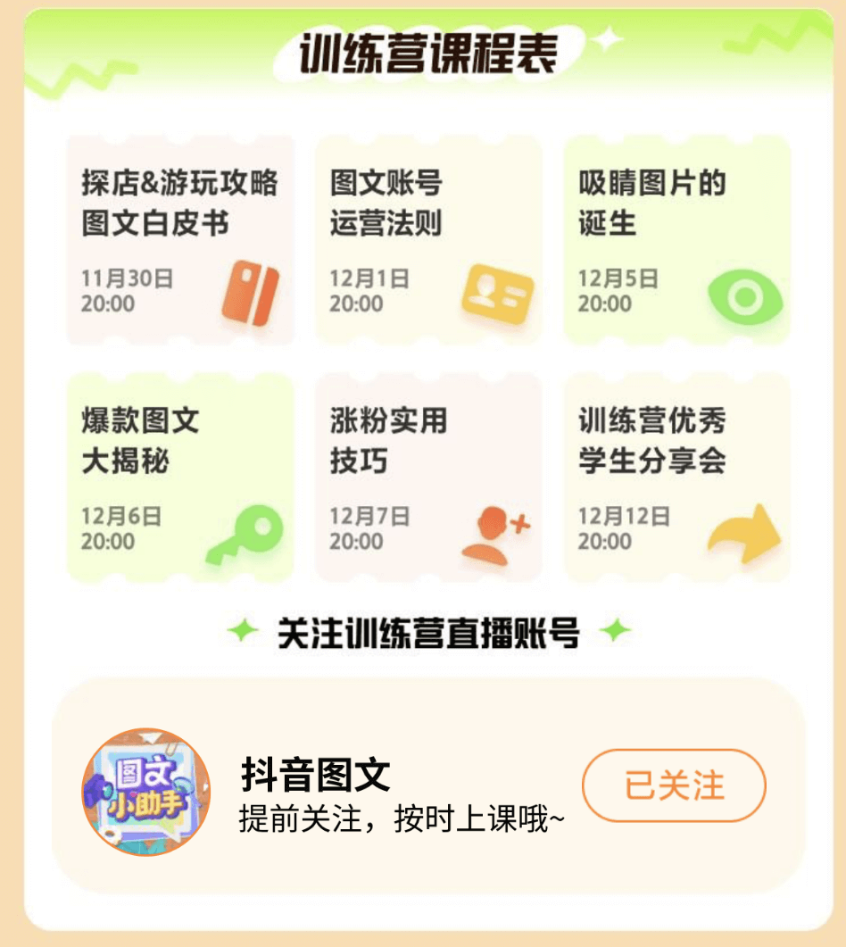 如果你错过了报名时间,关注@抖音图文,的直播号,也可以在此期间学习课程内容,课程表如下!