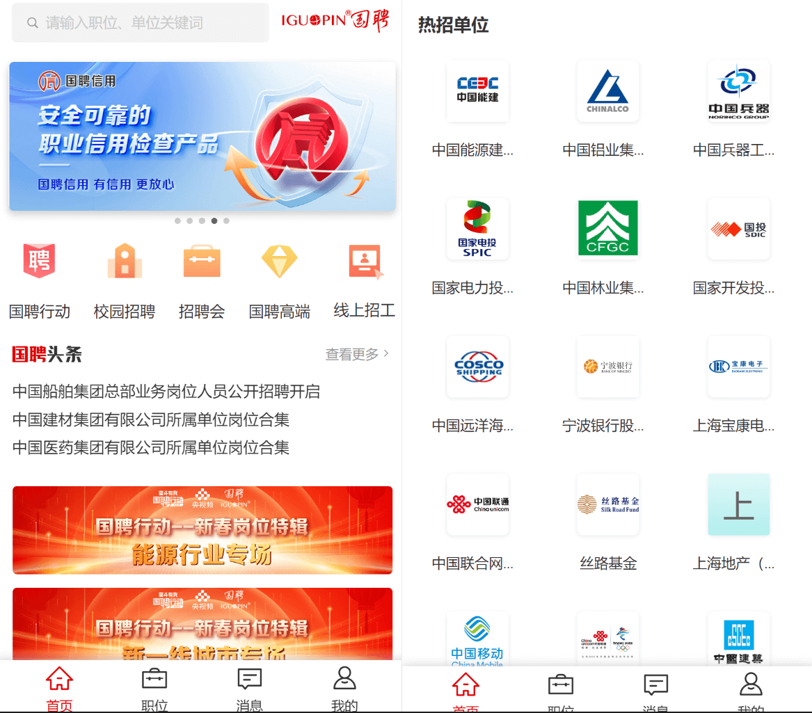 国聘招聘平台是来自国投人力旗下的高端招聘网络平台,这是针对国企、央企、事业单位的招聘网站,上万家国企央企入住,岗位种类繁多。每天都有相关招聘信息发布。无论是在校生、应届生、还是社会考生在这里都可以找到相关的信息!