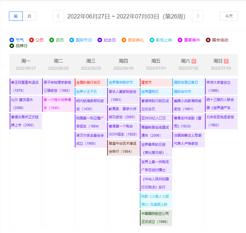 日历中包括每月:节气、公历、 农历、国际节日、 纪念日、 颁奖典礼、 影视上映、 重要事件、 展会活动、 品牌日 等扔点事件!